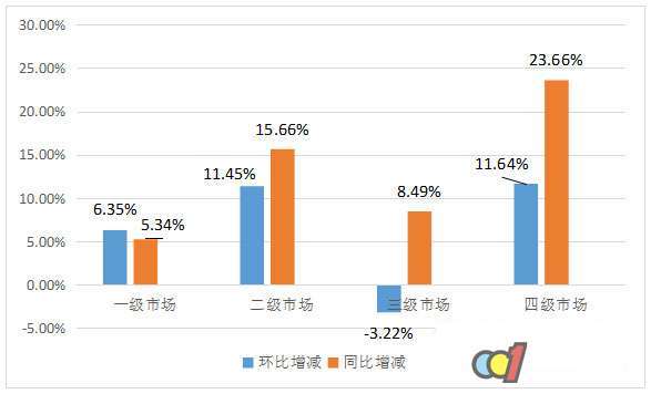 2016年1月份,热水器产品在一二三四级市场的销量环比、同比增减情况