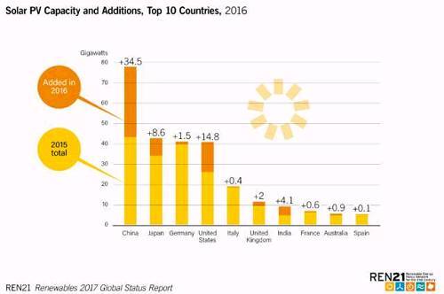 2016年,中国在非水可再生能源和燃料方面的投资排名世界第一,达783亿美元。中国可再生能源装机总量达564GW,居世界首位。风能和太阳能光伏的装机也均居世界首位。尽管大型光伏地面电站仍为主流,2016年中国新增分布式电站为4.26GW,为2015年的3倍。