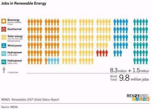 投资的增长带来了更多的就业岗位。截至2016年全球范围内共有980万人从事同可再生能源有关的工作。可再生能源不仅能解决化石能源领域的失业难题,同时也会成为全球经济的主要驱动力。