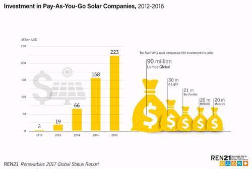 在发展中国家,无论是微网还是独立系统市场都在快速发展。由移动技术作为支持的随收随付(Pay-As-You-Go, PAYG)商业模式也十分活跃。市场对这一领域的投资迅速从2012年的300万美元上升至2.23亿美元。目前,微网市场每年的增长都超过2000亿美元。2016年,仅在风电和光伏领域就启动了超过23MW的微网项目。
