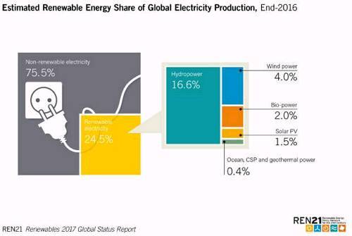 2016年,全球可再生能源新增装机161GW,超过当年所有化石能源净新增装机容量,占当年全球新增装机的62%。全球累计可再生能源装机近2017GW,占总装机的比例达到30%。值得注意的是,太阳能光伏净装机容量首次领先,占全球可再生能源新增装机的47%。