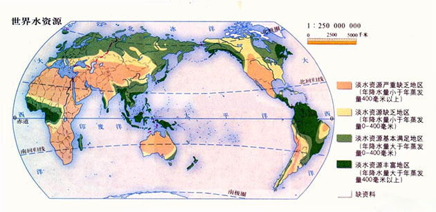 由于淡水分布的不均匀,地球陆地本来就有60%的地方是缺水地区和根本无水的沙漠。目前,全世界大约三分之一的人口生活在缺水状态中。据预测,到2025年,全世界三分之二的人口将生活在缺水状态中。