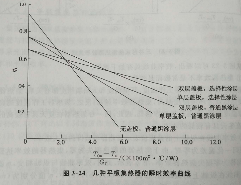 这说明,此时的集热板温度、流体平均温度、流体进口温度都相同。在图3-23中,3条效率曲线在横轴上有相同的交点值。还可以看出,(τa)e和Ul是影响平板集热器特性的最基本参量,如(τa)e值大,Ul值小,则平板集热器的运行温度高,集热器的热性能就高。Tpm=Tf,m=Tf.i=(τa)e/ Ul GT+Ta