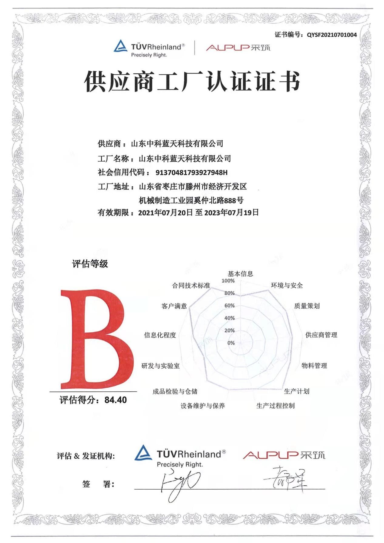 中科蓝天公司全面推行质量管理,率先在同行业中通过 ISO9001:2008 质量管理体系认证、ISO14001:2004 环境管理体系认证、职业健康安全管理体系认证、中国国家强制性产品3C 认证、中国节能产品认证、中国环保产品认证、并荣获“国家高新技术企业”、“中国驰名商标”、“山东省名牌产品”、“省级重合同守信用”等称号;被财政部、国家发展改革委列入“节能产品政府采购清单”,是中国节能协会热泵专业委员会理事单位;山东省建筑节能协会理事单位,2018年 2 月公司产品被授予“枣庄市市长质量奖”荣誉。