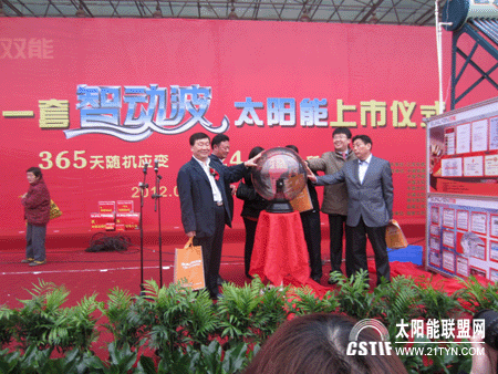 江苏双能太阳能有限公司在本次博览会隆重举行了“全球第一套智动波太阳能”上市启动仪式。中国中国节能协会太阳能专业委员会秘书长霍志臣、全国太阳能标准化技术委员会秘书长、江苏双能太阳能有限公司常务副总贲道发、以及湖南卫视、长沙电视台、中国科技日报、中国能源报、人民网、新浪网、中国房地产报、《中国太阳能产业资讯》、《中国太阳能工程》、《太阳能》、《太阳界》等几十家媒体,共同见证代表着太阳能行业“再节能”集成技术领域前沿成果的“智动波太阳能”新品全球上市仪式及现场演示体验活动。