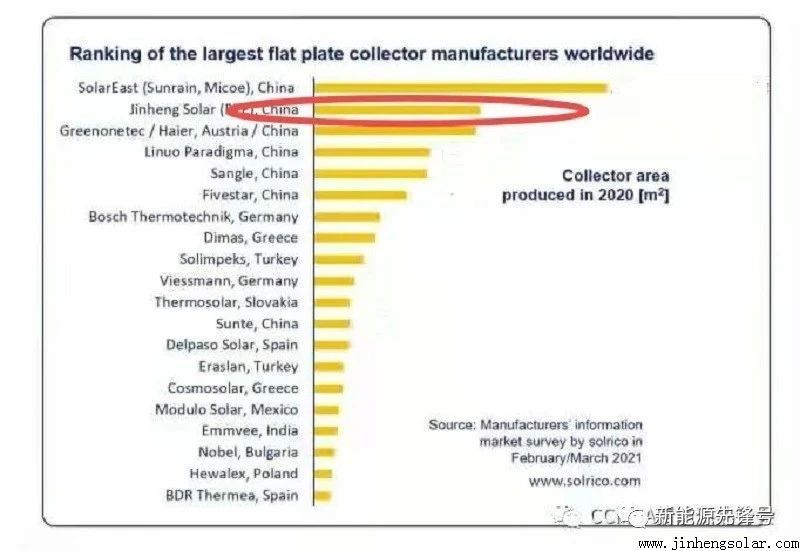 由德国咨询公司solrico 2021年最新出炉的 世界大型平板太阳能集热器最新排行 显示,金亨新能源在2020年度的产销量位列全球第二。 在...