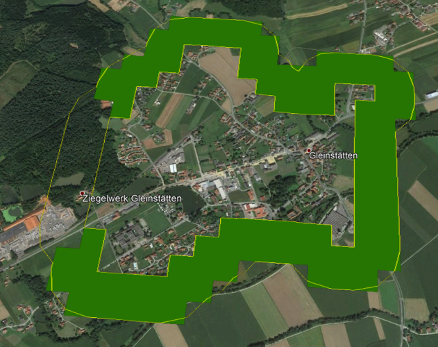 奥地利Gleinstätten的这张照片中的绿色表示SDH安装在该镇边界的200米区域的潜在区域。 用于农业的土地以及一些未开发的地区如草地被认为是合适的。