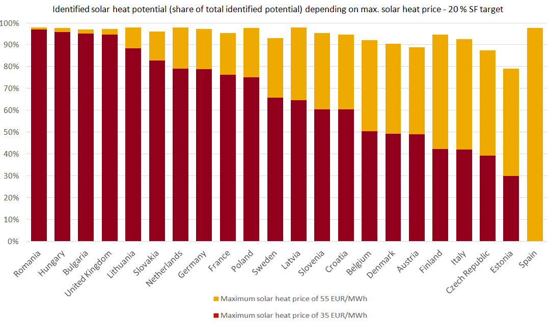 在较小的欧洲城镇,现有的区域供热网络的技术太阳能相关潜力,其中不使用废热,但太阳能热量满足年度区域供热需求的20%。