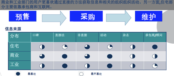 另一方面,在住宅领域的用户关键的信息来源是承包商/顾问和互联网。万一用户有感兴趣的产品,他们通常联系承包商以获得该产品。