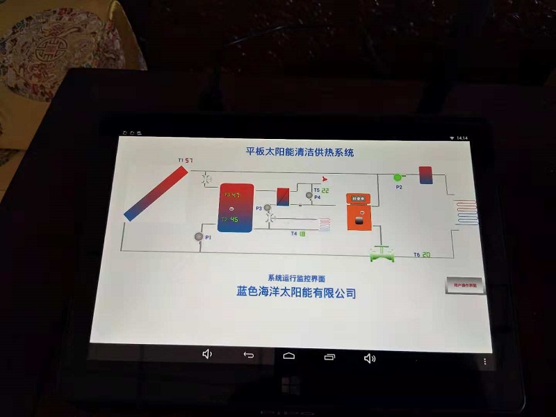 在公司的“平板太阳能清洁供热系统运行监控界面”上显示,楼顶集热器输出温度为57℃(T1),我们所在的办公室回水温度为20℃(T6),靠近门口的房间回水温度为18℃。我们体验时候,未见空气源热泵工作。