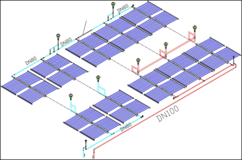 大型工业太阳能集热阵列,单系统吨位都超过50t,传统的25mm小口径倾斜式串并联集热模式,远不能满足如此大吨位的系统需求。最易发生上述流体危害。