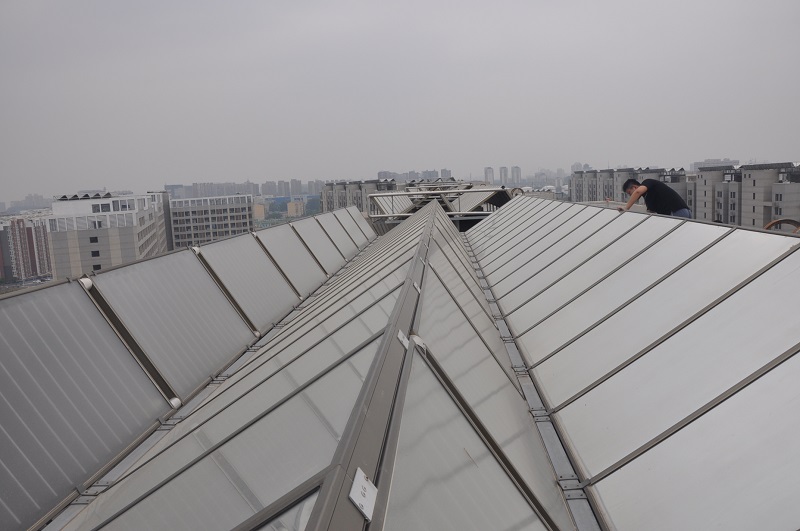 集热器密排,由西向东组成一个大串联系统;列与列之间的两端由管道连接,构成一个三串二并的集中集热单元。如果不采用这种结构的集热器,势必加大排与排之间的距离,楼顶面积远远不够。