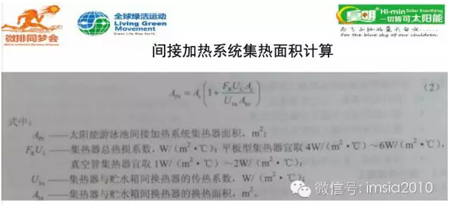 再一个是集热器的集热效率,这一个标准上没有给参考值,在其他的国标上有一个经验值,就我们选的时候,也是在这个范围之内是0.4到0.55。像皇明的,我们做游泳池的时候选择的0.5的。再一个就是管入及出水箱热量损失,这个选系数从0.1到0.2,一般选0.2的比较多,有20%的热量损失。