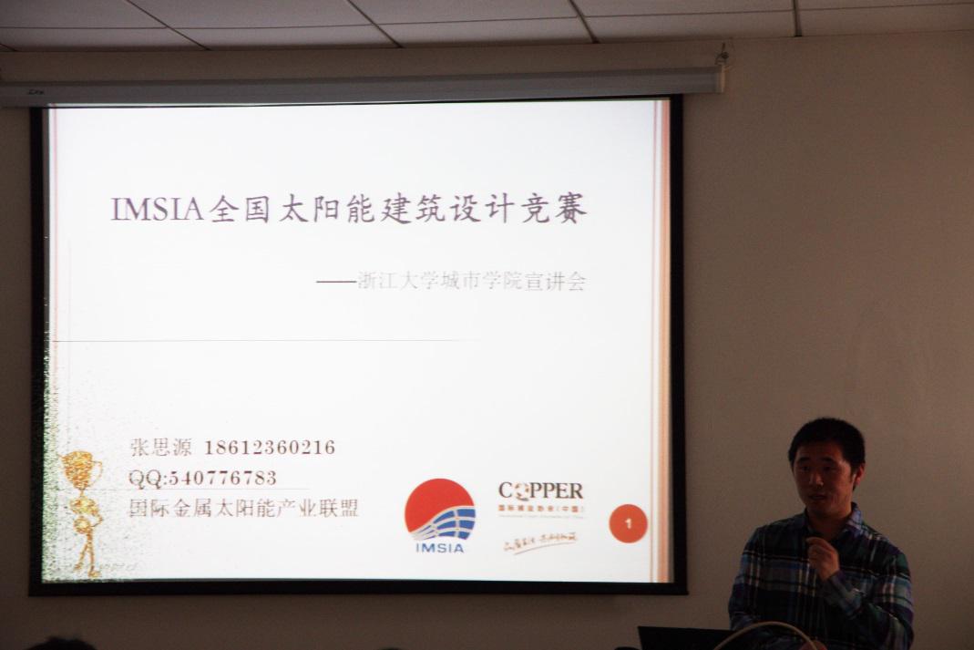 下午两点,竞赛的宣讲会在浙江大学城市学院北校区理工三号楼准时开始。国际金属太阳能产业联盟设计竞赛工作组成员张思源首先讲解了竞赛的相关信息,主要从竞赛简介、竞赛要求、对象形式、赛程安排、评审标准、奖项设置等几个方面对竞赛做了详细的介绍,并指出了往届竞赛中出现的一些问题,让大家对于竞赛有了进一步的了解。